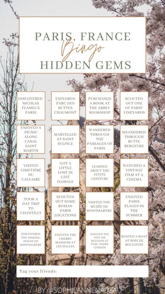 There are four categories; 1- Paris bingo (one for tourist landmarks and things to do and one for ‘off the beaten path’ atractions), 2- This or That (one for general Paris preferences and the other for Paris foodstuffs)