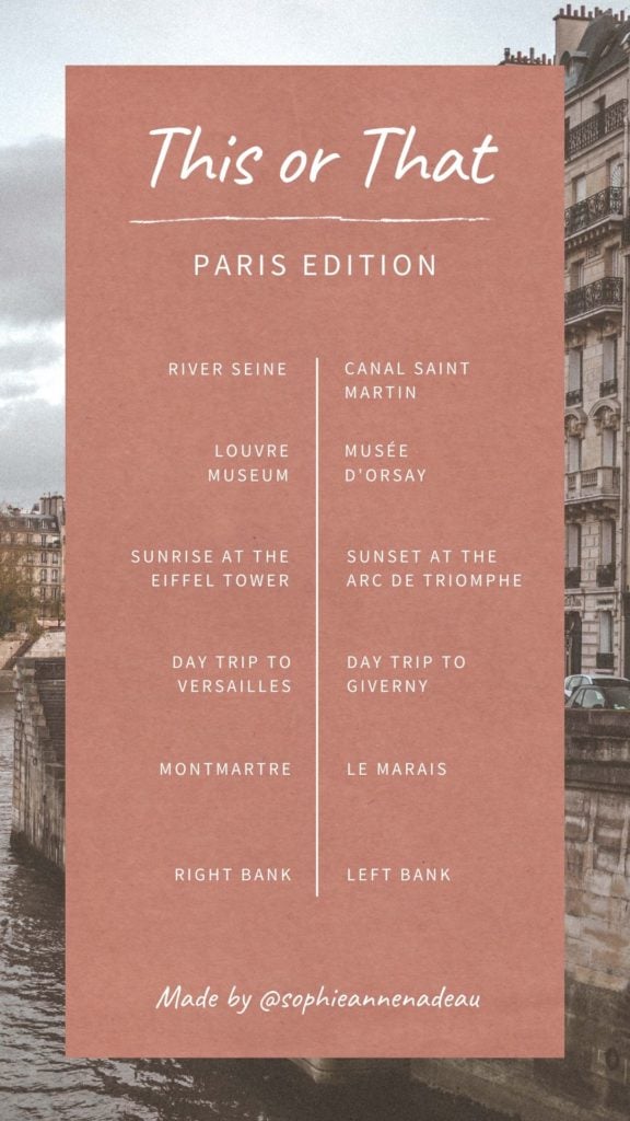 Looking to quiz your friends and yourself on your stories on social media? I’ve created some downloadable Paris Instagram Story Templates which you can upload to your own Instagram stories and fill out at your leisure.