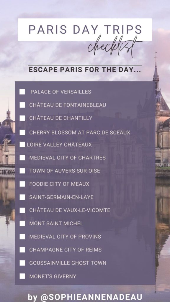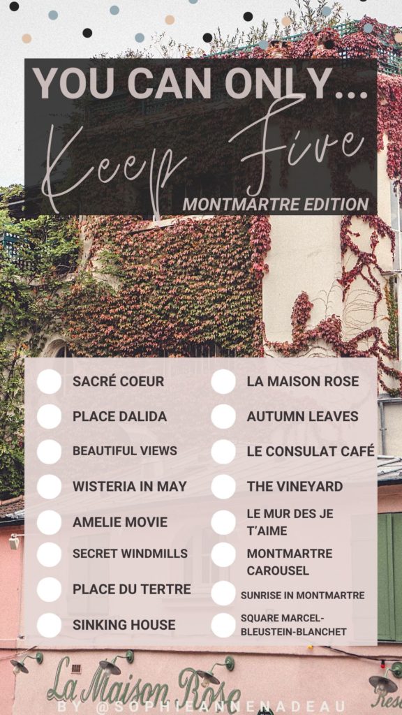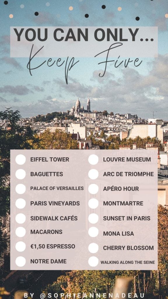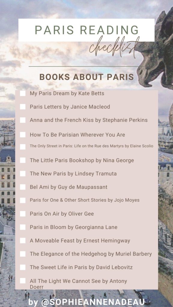 3- Paris checklists (one for books about Paris that you’ll love and one for day trips from Paris), and finally, 4- a ‘you can only keep five’ (one for general Paris and one for the district of Montmartre). For the final two stories, you’ll have to just check the five boxes of the things about Paris you’d most like to keep (no cheating!)