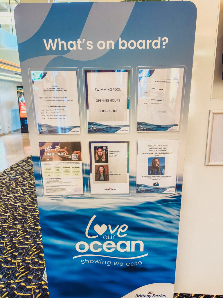 As we were travelling by car, we were then swiftly placed in a car queue before driving on board with the car. Once you’re parked up, you get the things you need from your car (access to the car deck is strictly forbidden during the crossing- it is possible but you have to head to the information deck and are then allowed to go down with a member of staff) before heading to the upper decks.