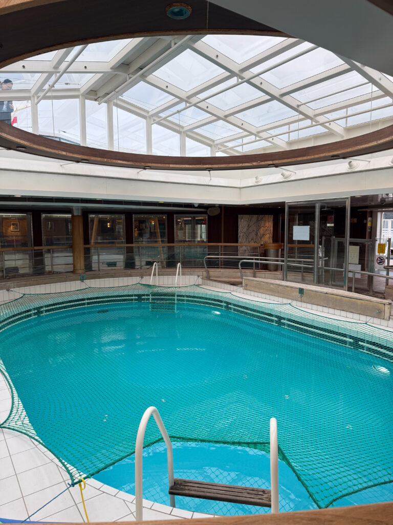 - Pool area: I was very surprised to find a swimming pool onboard. It’s only open during the daytime and so we weren’t able to test it out. It’s pretty small and typically open from the late spring through to the early autumn.